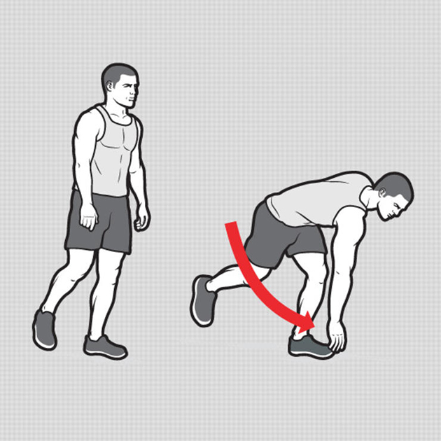 Встань на левую ногу, слегка согнув ее в колене. Согнись в поясе, вытянув перед собой правую руку и постепенно опуская ее вниз, пока не коснешься ей носка левой ноги. Вернись в исходное положение и поменяй опорную ногу.