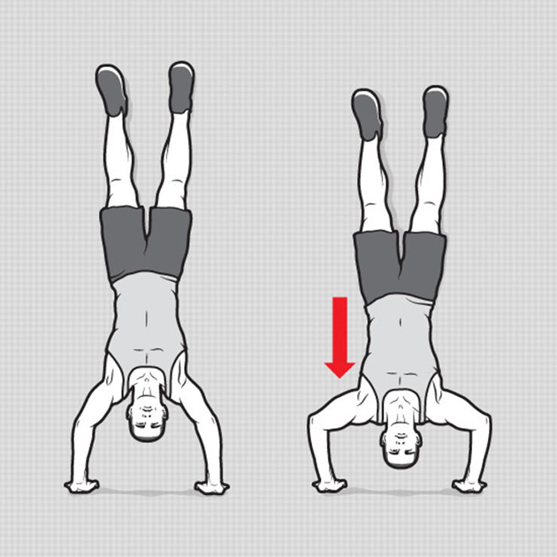 Поставь руки ладонями вниз примерно в 10 см от стены. Встань на руки, опираясь ногами о стену. Медленно согни руки и опусти голову в сторону пола. Сложно? Тогда начни с отжиманий с утяжелением и постепенно осваивай стойку на руках.